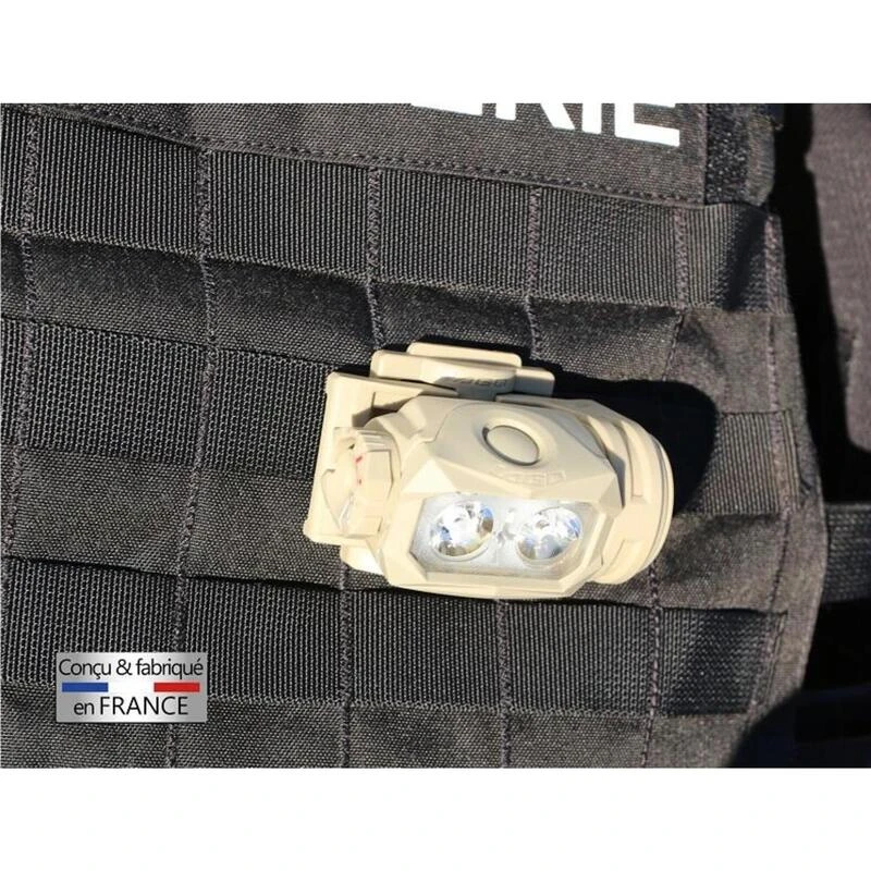 La frontale de l’armée française ! Une optique développée spécifiquement pour la marche rapide, lumière rouge pour préserver la vision nocturne. Bandeau camouflage OTAN. Chasse, Pêche, Astronomie.