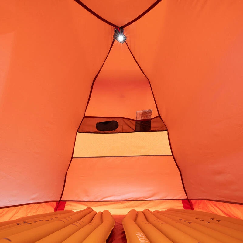 Chambre en moustiquaire pour la ventilation et en tissu dĂ©perlant pour protĂ©ger de la condensation et des courants d’air. Il y a une ventilation Ă l’arriĂšre de la tente.
