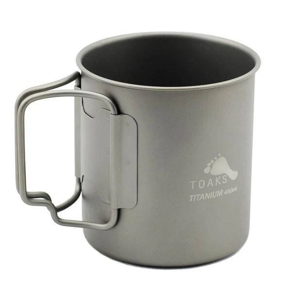 Mugue en titane léger de Toaks avec une capacité de 450ml. Livré avec un sac en nylon.